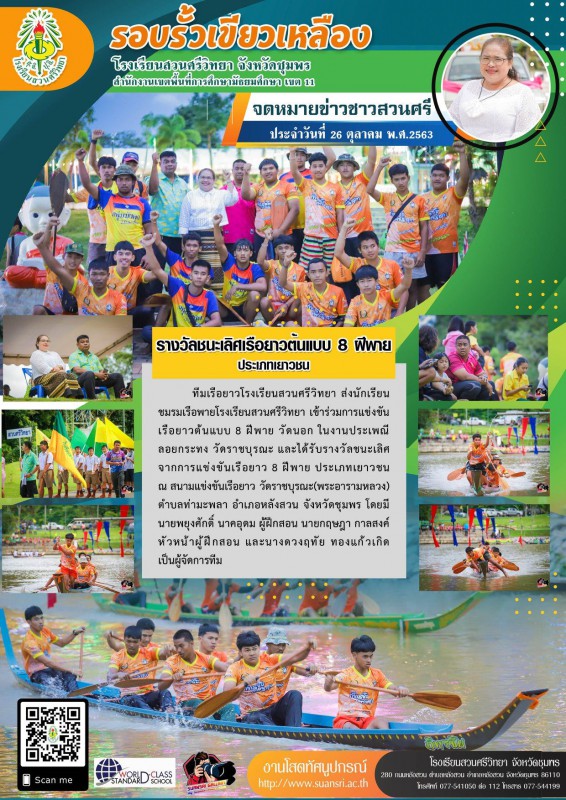 29 ตุลาคม 2563 ทีมเรือยาวโรงเรียนสวนศรีวิทยา ส่งนักเรียนชมรมเรือพายโรงเรียนสวนศรีวิทยา เข้าร่วมการแข่งขันเรือยาวต้นแบบ 8 ฝีพาย วัดนอก ในงานประเพณีลอยกระทง วัดราชบุรณะ และได้รับรางวัลชนะเลิศ จากการแข่งขันเรือยาว 8 ฝีพาย ประเภทเยาวชน ณ สนามแข่งขันเรือยาว วัดราชบุรณะ(พระอารามหลวง) ตำบลท่ามะพลา อำเภอหลังสวน จังหวัดชุมพร โดยมีนายพยุงศักดิ์ นาคอุดม ผู้ฝึกสอน นายกฤษฎา กาลสงค์ หัวหน้าผู้ฝึกสอน และนางดวงฤทัย ทองแก้วเกิด ผู้จัดการทีม