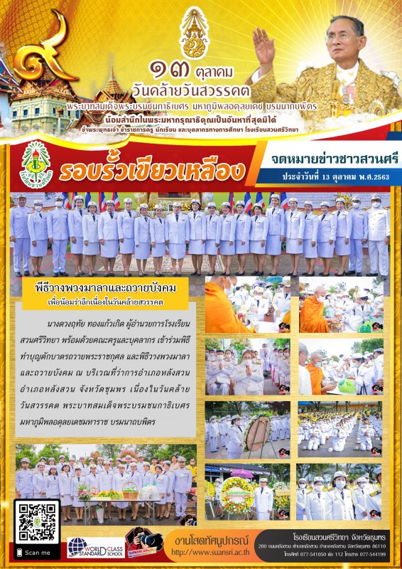 13 ตุลาคม 2563 นางดวงฤทัย ทองแก้วเกิด ผู้อำนวยการโรงเรียนสวนศรีวิทยา พร้อมด้วยคณะครูและบุคลากร เข้าร่วมพิธีทำบุญตักบาตรถวายพระราชกุศล และพิธีวางพวงมาลาและถวายบังคม ณ บริเวณที่ว่าการอำเภอหลังสวน อำเภอหลังสวน จังหวัดชุมพร เนื่องในวันคล้ายวันสวรรคต พระบาทสมเด็จพระบรมชนกาธิเบศร มหาภูมิพลอดุลยเดชมหาราช บรมนาถบพิตร