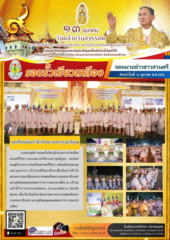 13 ตุลาคม 2563 นางดวงฤทัย ทองแก้วเกิด ผู้อำนวยการโรงเรียนสวนศรีวิทยา มอบหมายให้นางสาวสุกัญญา ขอรัตน์ รองผู้อำนวยการโรงเรียนสวนศรีวิทยา พร้อมด้วยคณะครูและบุคลากร เข้าร่วมพิธีจุดเทียนเพื่อน้อมรำลึกในพระมหากรุณาธิคุณพระบาทสมเด็จพระบรมชนกาธิเบศร มหาภูมิพลอดุลยเดชมหาราช บรมนาถบพิตร ณ บริเวณหน้าที่ว่าการอำเภอหลังสวน อำเภอหลังสวน จังหวัดชุมพร เนื่องในวันคล้ายวันสวรรคต พระบาทสมเด็จพระบรมชนกาธิเบศร มหาภูมิพลอดุลยเดชมหาราช บรมนาถบพิตร