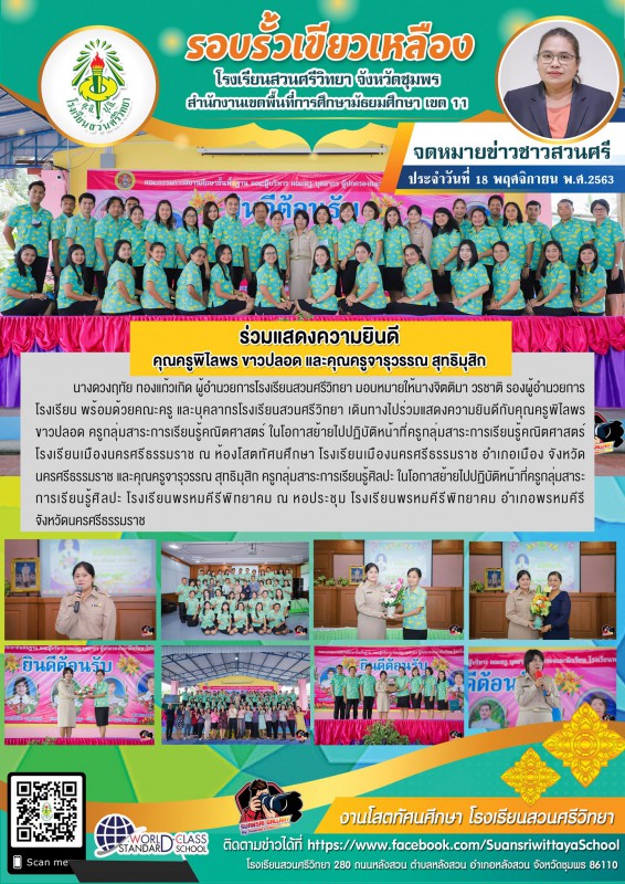 18 พฤศจิกายน 2563 นางดวงฤทัย ทองแก้วเกิด ผู้อำนวยการโรงเรียนสวนศรีวิทยา มอบหมายให้นางจิตติมา วรชาติ รองผู้อำนวยการโรงเรียน พร้อมด้วยคณะครู และบุคลากรโรงเรียนสวนศรีวิทยา เดินทางไปร่วมแสดงความยินดีกับคุณครูพิไลพร ขาวปลอด ครูกลุ่มสาระการเรียนรู้คณิตศาสตร์ ในโอกาสย้ายไปปฏิบัติหน้าที่ครูกลุ่มสาระการเรียนรู้คณิตศาสตร์ โรงเรียนเมืองนครศรีธรรมราช ณ ห้องโสตทัศนศึกษา โรงเรียนเมืองนครศรีธรรมราช อำเภอเมือง จังหวัดนครศรีธรรมราช และคุณครูจารุวรรณ สุทธิมุสิก ครูกลุ่มสาระการเรียนรู้ศิลปะ ในโอกาสย้ายไปปฏิบัติหน้าที่ครูกลุ่มสาระการเรียนรู้ศิลปะ โรงเรียนพรหมคีรีพิทยาคม ณ หอประชุม โรงเรียนพรหมคีรีพิทยาคม อำเภอพรหมคีรี จังหวัดนครศรีธรรมราช