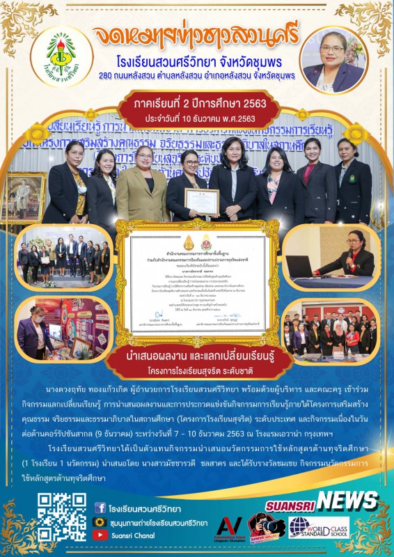 7-10 นางดวงฤทัย ทองแก้วเกิด ผู้อำนวยการโรงเรียนสวนศรีวิทยา พร้อมด้วยผู้บริหาร และคณะครู เข้าร่วมกิจกรรมแลกเปลี่ยนเรียนรู้ การนำเสนอผลงานและการประกวดแข่งขันกิจกรรมการเรียนรู้ภายใต้โครงการเสริมสร้างคุณธรรม จริยธรรมและธรรมาภิบาลในสถานศึกษา (โครงการโรงเรียนสุจริต) ระดับประเทศ และกิจกรรมเนื่องในวันต่อต้านคอร์รัปชันสากล (9 ธันวาคม) ระหว่างวันที่ 7 – 10 ธันวาคม 2563 ณ โรงแรมเอวาน่า กรุงเทพฯ