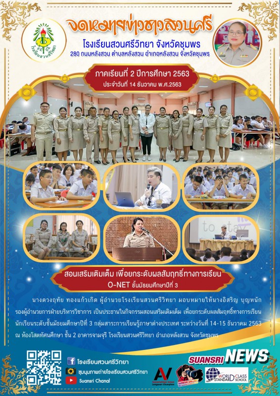 14 ธันวาคม 2563 นางดวงฤทัย ทองแก้วเกิด ผู้อำนวยโรงเรียนสวนศรีวิทยา มอบหมายให้นางอิสริญ บุญหนัก รองผู้อำนวยการฝ่ายบริหารวิชาการ เป็นประธานในกิจกรรมสอนเสริมเติมเต็ม เพื่อยกระดับผลสัมฤทธิ์ทางการเรียน นักเรียนระดับชั้นมัธยมศึกษาปีที่ 3 กลุ่มสาระการเรียนรู้ภาษาต่างประเทศ ระหว่างวันที่ 14-15 ธันวาคม 2563 ณ ห้องโสตทัศนศึกษา ชั้น 2 อาคารจามจุรี โรงเรียนสวนศรีวิทยา อำเภอหลังสวน จังหวัดชุมพร