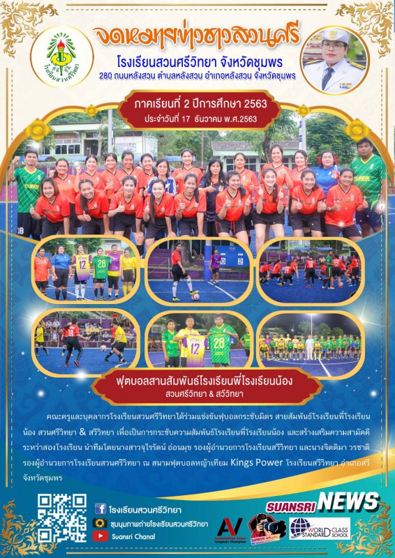 17 ธันวาคม 2563 คณะครูและบุคลากรโรงเรียนสวนศรีวิทยาได้ร่วมแข่งขันฟุตบอลกระชับมิตร สายสัมพันธ์โรงเรียนพี่โรงเรียนน้อง สวนศรีวิทยา & สวีวิทยา เพื่อเป็นการกระชับความสัมพันธ์โรงเรียนพี่โรงเรียนน้อง และสร้างเสริมความสามัคคีระหว่าสองโรงเรียน นำทีมโดยนางสาวจุไรรัตน์ อ่อนมุข รองผู้อำนวยการโรงเรียนสวีวิทยา และนางจิตติมา วรชาติ รองผู้อำนวยการโรงเรียนสวนศรีวิทยา ณ สนามฟุตบอลหญ้าเทียม Kings Power โรงเรียนสวีวิทยา อำเภอสวี จังหวัดชุมพร